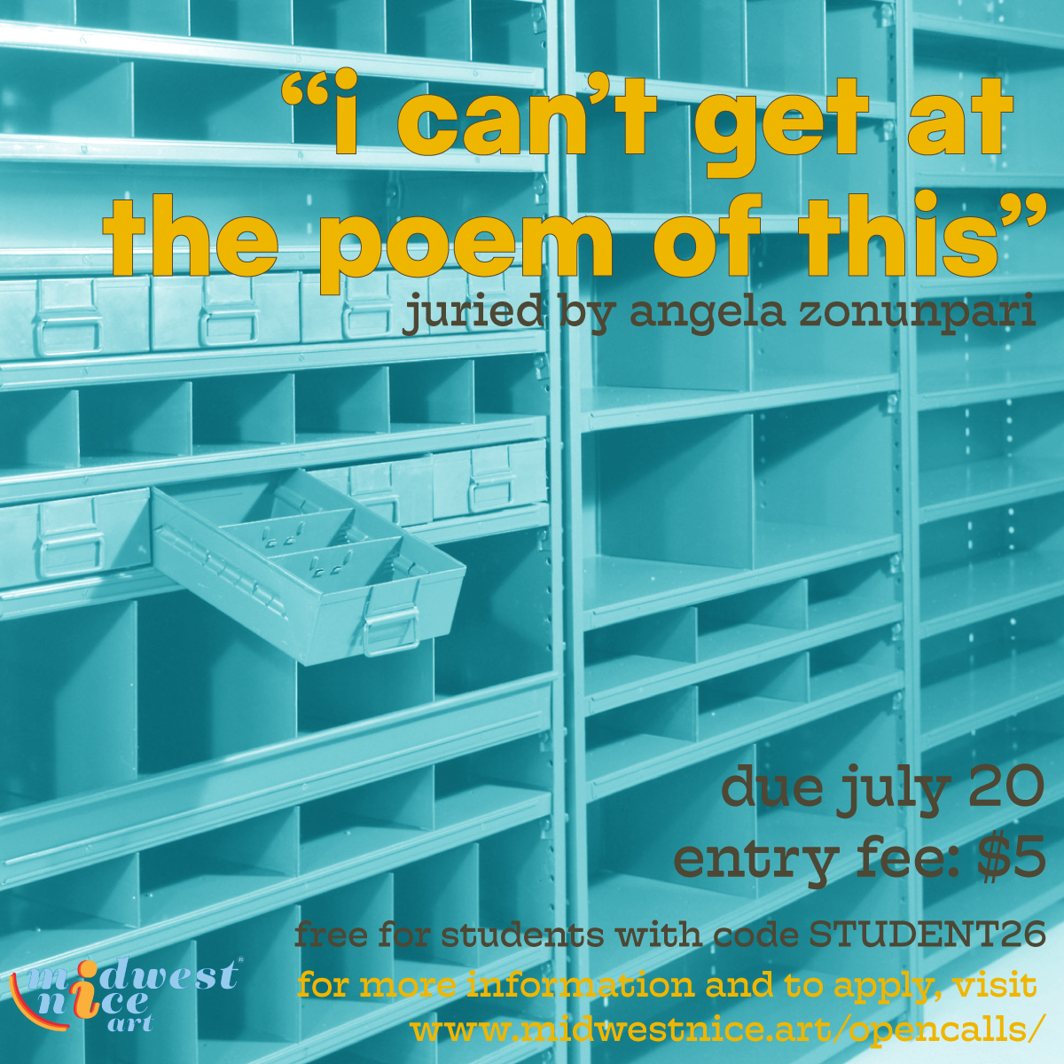 Submissions are due July 20. The online exhibition—“i can’t get at the poem of this”— will be on-view on August 1. Selected submissions will be notified by july 26. this exhibition is juried by angela zonunpari.